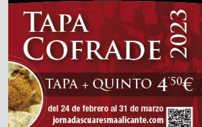Ya ha arrancado la IV edición de las Jornadas Gastronómicas de Alicante que se prolongarán hasta el 31 de marzo para conmemorar la Semana Santa alicantina, declarada Bien de Interés Turístico Nacional. En este contexto se celebrará el popular evento gastronómico Tapa Cofrade en el que este año participan 17 bares y restaurantes, la mayoría de los cuales ofrecen una tapa para celíacos.