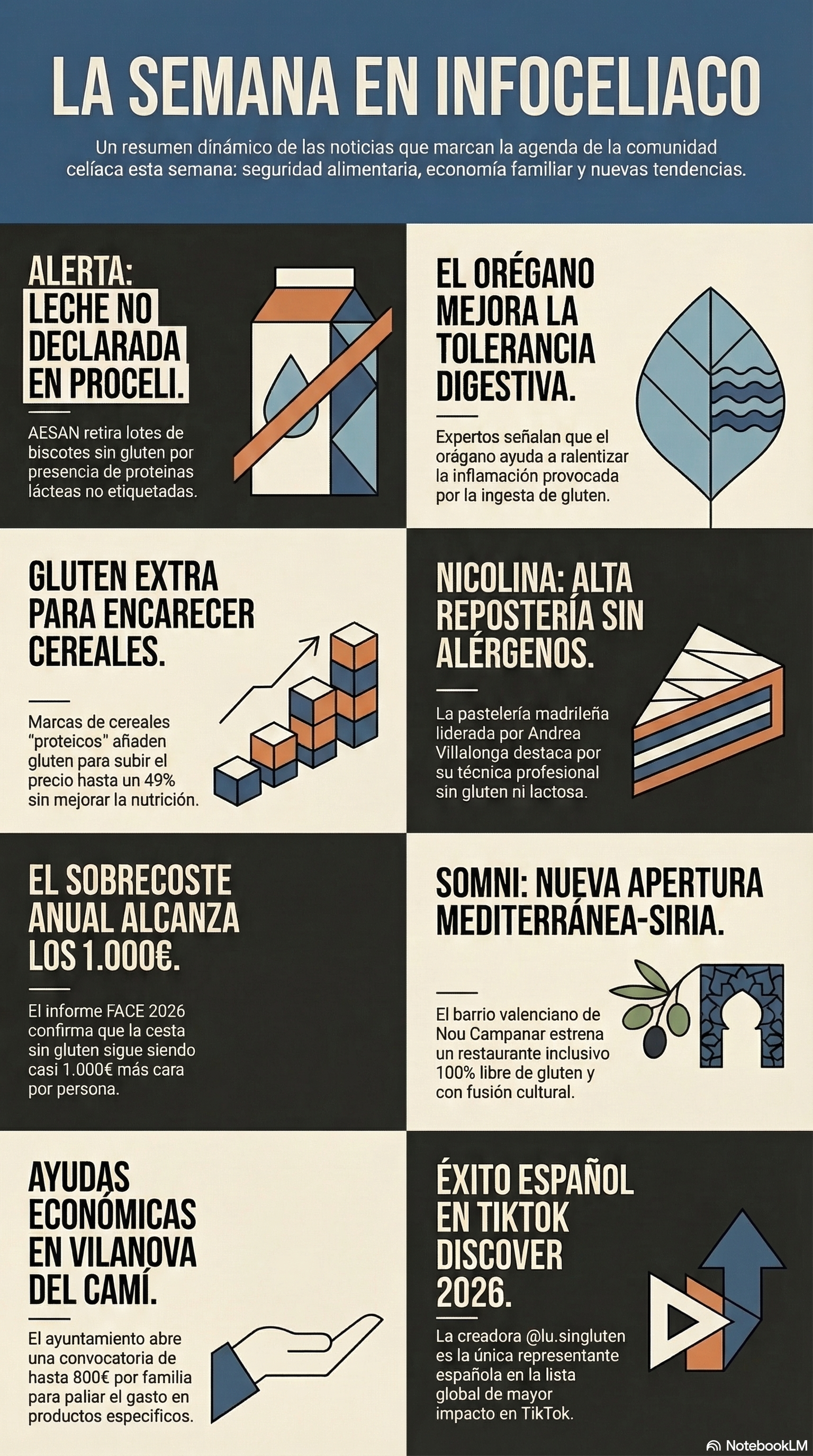 Arturo Cuervo La semana en Infoceliaco en un vistazo (6 de Marzo de 2026)... Next Article Añaden gluten para cobrar más: inflan hasta un 49 % el precio de los cereales proteicos últimas noticias La semana en Infoceliaco en un vistazo (6 de Marzo de 2026)... Añaden gluten para cobrar más: inflan hasta un 49 % el precio de los cereales proteicos Somni, el nuevo templo valenciano de la gastronomía sin gluten Alerta alimentaria por leche no declarada en unos biscotes sin gluten El orégano ayuda a tolerar mejor el gluten al ralentizar la inflamación lo más visto Foster´s Hollywood cobra más por el agua para celíacos Un nuevo fármaco permite diagnosticar la celiaquía desde casa Mercadona venderá desde octubre la cerveza Ambar para celíacos La Junta de Comunidades de Castilla la Mancha convoca ayudas para enfermos celíacos Identifican una bacteria que neutraliza la toxicidad del gluten