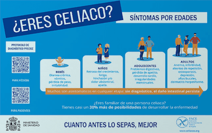 En concreto, se trata de un cartel informativo de “diagnóstico precoz” en el que se señalan cuáles son los síntomas de la enfermedad celíaca por edades, destacando que esta puede aparecer en cualquier edad de la vida, y afectando tanto a niños como a los adultos.