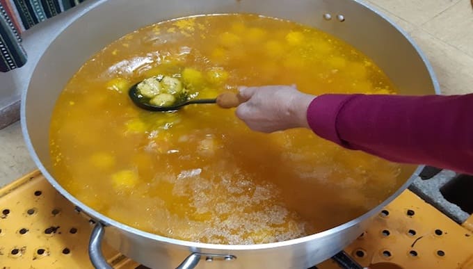 La pedanía murciana de Patiño volvió a bullir de gente durante la preparación de sus tradicionales ollas dispuestas para repartir cerca de 200.000 pelotas con su caldo, un buen número de ellas elaboradas sin gluten, por lo que fueron apatas para celíacos, preparadas con productos que da la huerta y la Región murcianas.
