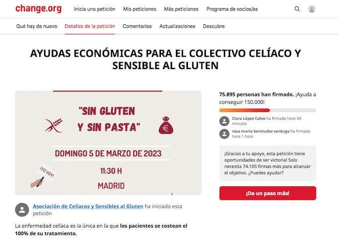 La Asociación de Celíacos y Sensibles al Gluten ha reunido ya casi de 76.000 firmas en la plataforma Change.org para pedir a la Administración ayudas económicas para los pacientes celíacos. Ahora reclaman un último esfuerzo para conseguir 150.000 firmas necesarias para que la voz de este colectivo sea escuchada y sus demandas atendidas.