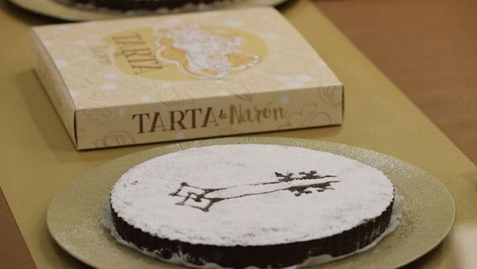 Sobre el azúcar espolvoreado en la tarta se dibujan las llaves del escudo de Narón; pero también la caja que la transporta cuenta con otro símbolo de este municipio: el molino de As Aceas con un nogal al lado.